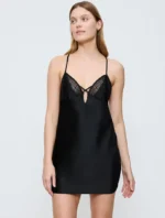 Uma combinação sexy e que aumenta a confiança. As pregas de cetim brilhante em torno da sua silhueta, as costas cruzadas e as aplicações em renda dão um toque de glamour.