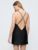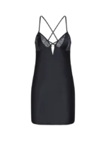 - Decote profundo nas costas com alças cruzadas, aplicações em renda e acessórios metálicos para um toque extra de glamour