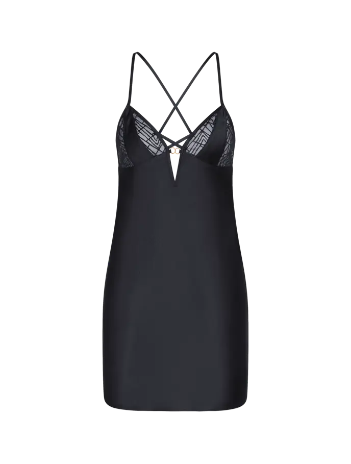 Uma combinação sexy e que aumenta a confiança. As pregas de cetim brilhante em torno da sua silhueta, as costas cruzadas e as aplicações em renda dão um toque de glamour.